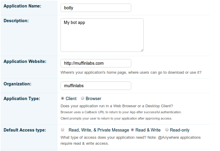 First, go to Twitter's Register New Application page. You need to be logged into Twitter at this point, but you do not need to be logged in as your bot. Fill out this form (click to make biggish):